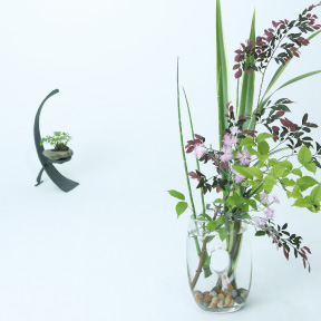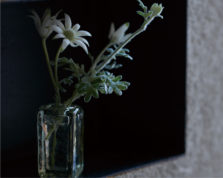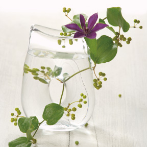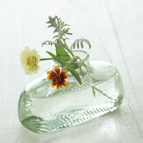 このガラスを使った花器は、窓辺に置くと陽射しを